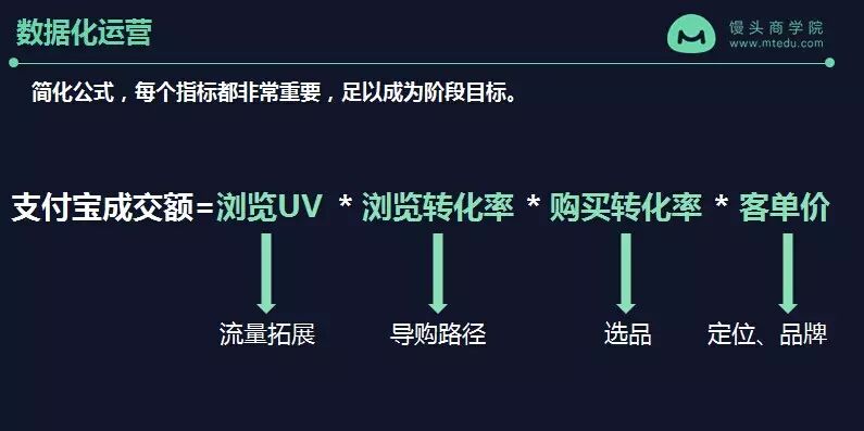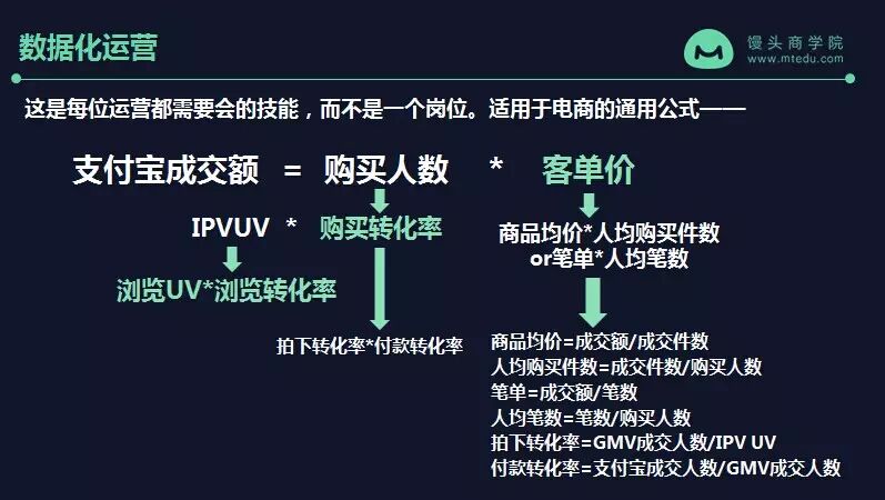 这里有一个一个通用的电商通用的公式,在阿里也是被不断不断地去提的:支付宝成交额=购买人数*客单价