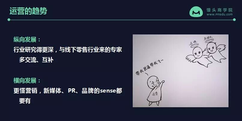 在我眼里运营会往什么趋势发展呢?一个是纵向发展一个是横向发展。纵向发展每个行业会研究得更深。像阿里有一些新增的运营都是从线下各个零售行业进来的专家,如果大家能线上线下把这些经验去结合,多交流,多互补的话,对于你对行业的研究认识会更加深入。还有一种是横向发展,在你有了一定的运营经验之后,你去研究一些营销的东西,懂新媒体、PR、品牌的东西会更有利于你的发展。所以我应该算是走的第二条路,也是为什么我又到了天猫市场部,也引出了我们下一部分内容: