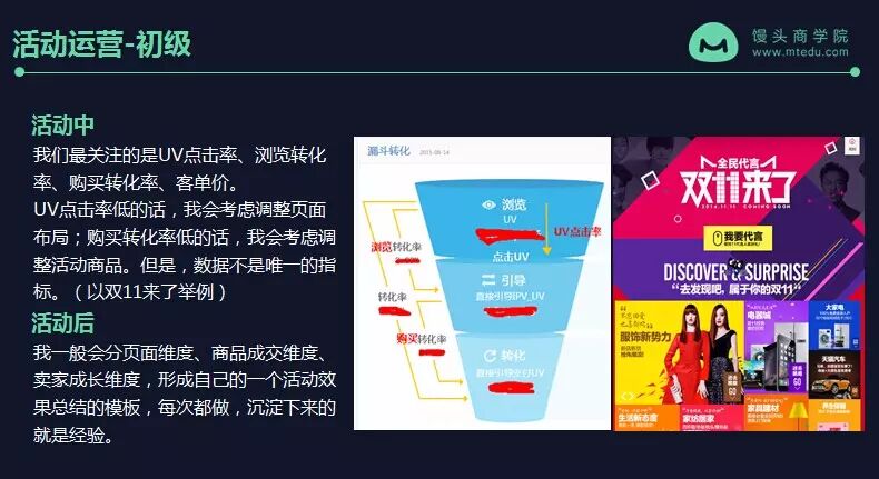 活动期间,我会密切去关注这个数据,如果发现UV点击率低,也就是说到了双11来了这张页面来了很多人可是点击的很少,我就会考虑调整页面布局,或者调整Banner上每一个区块的文案或者图片,让他更加吸引人有点击的欲望。如果我发现这张页面购买转化率低的话,我会去调整活动商品,可是这个商品不够吸引人。但是数据也不是唯一的指标。