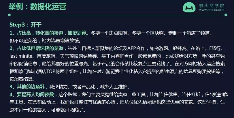 第二个要做的就是,你会发现有些占比低但是增速快的渠道,你会花更多的精力去培育这些渠道。比如说,我们发现人们在订酒店之前,他会先去一些论坛或者是一些攻略网站去看,所以说流量入口的话就是,我们会关注到穷游网、蚂蜂窝可能成了旅行人群的第一流量入口,那这个时候我会跟他们聊合作。