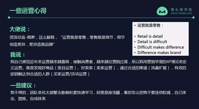 大家好,非常高兴能在馒头商学院的馒头微课跟大家做这次分享。我在阿里的时候经常参加一些培训,我觉得印象蛮深的是一位资深总监叫微渺,TA说“运营就是零售,零售就是细节,细节创造差异,差异造就品牌”。其实有的时候,我们会觉得运营很大,很难去解析它或去着手,其实想一下,它跟线下的零售是相通的。比如大家走进商场看一看,很多规律都是一致的,只是一些细节不一样。所以,运营的好坏考验的就是细节的功夫。