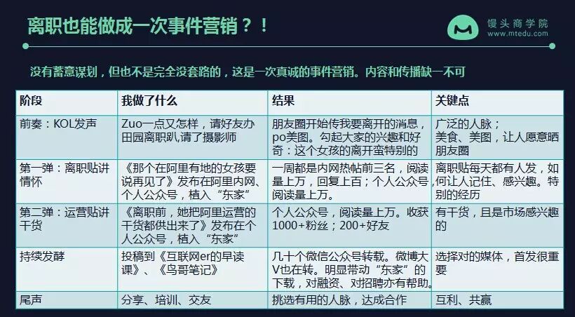 当时带来的一些效应就是我自己的知名度有提高,我的新公司东家的下载量也提升很多。老板很高兴,我做的一次蓄意的事件营销。其实我没有蓄意谋划,我只是觉得漂漂亮亮的有仪式感的告别阿里进入新公司。但是从这个过程当中,其实你回过头来看是有一些套路的。可能是我在天猫市场部的一些营销经验,融入到里面去,所以我也愿意去理一理,向大家展示一下这个过程。其实做事件营销大概也是这个套路。