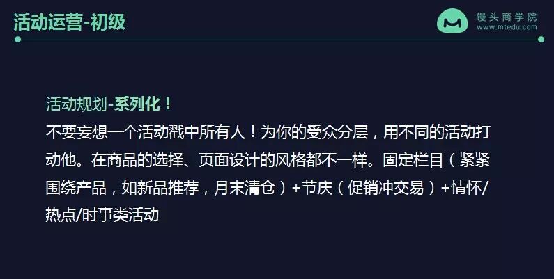 一个初级的活动运营至少要做到活动规划要有系列化。不要妄想一个活动戳中所有人。为你的受众分层,用不同的活动打动他。因为有了不同的分层,所以在商品的选择、页面设计的风格都不一样,这样就不会让你每一张活动页面看起来都没有个性,都像一个大杂烩一样。一个有系列的活动规划,大概会有这固定栏目、会有节庆促销,会有情怀/热点/时事类活动这三个部分组成。