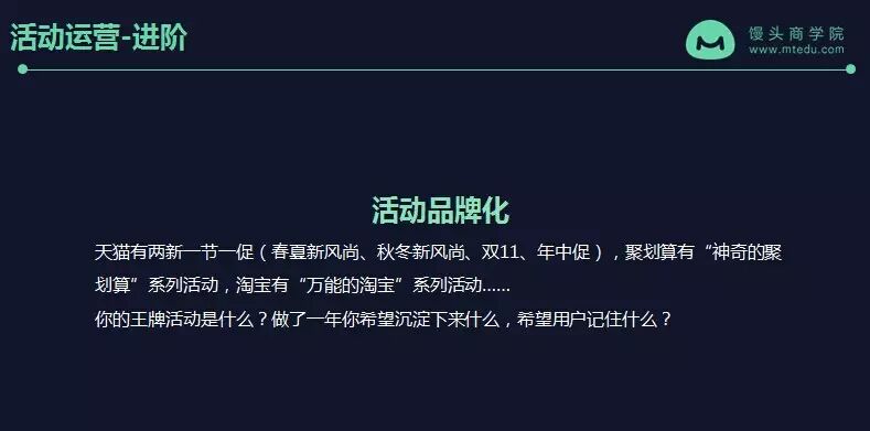 不知道大家知道吗,天猫有两新一节一促,两新是指春夏新风尚、秋冬新风尚,一节是指双11,一促是指年终促,是天猫最大的四个活动,是已经有一定的知名度了,它的一个招牌品牌化的活动。聚划算有“神奇的聚划算”系列活动,淘宝有“万能的淘宝”系列活动……你的王牌活动是什么呢?做了一年活动你希望沉淀下来什么,希望用户记住什么?我相信你一定不想让用户记住你只是在卖卖卖,在做各种促销。那你是希望有一些品牌的东西,或有一些用户心智的东西留下来,所以你一定要做活动品牌化。