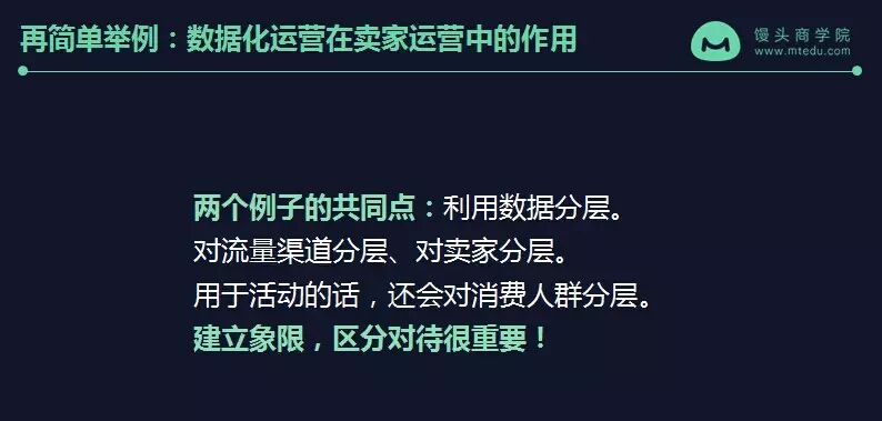 其实我们刚刚说的这两个例子,它们有个共同点:利用数据分层。不管是对流量渠道分层还是对卖家分层。数据用于活动,我们还会对消费人群分层。综上,我感觉就是:我拿到一个问题,或拿到一个case,我会不自觉的画一个象限,把这个渠道也好或问题也好分成四个象限,建立象限,区分对待很重要。