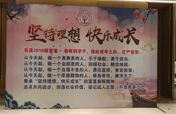 “从今天起,做一个真善美的人,乐于奉献,勇于担当;从今天起,做一个会感恩的人,回报社会,精忠报国;从今天起,做一个自强不息的人,勇往直前,奋发图强;从今天起,做一个厚德载物的人,修身养性,兼济天下;秉承坚持理想•快乐成长”的富基春晖精神,追求共同进步,创造社会价值,谨记成人之誓,不负青春之志”...... 8月18日下午,由长沙慈善会主办、湖南省魏朝阳公益基金会承办的“坚持理想•快乐成长——2018届富基•春晖班毕业成人礼”活动在长沙市普瑞温泉酒店举行,来自望城一中、平江二中的100多名富基•春晖班应届毕业生学子陆续跨过“成人门”,集体庄严宣誓,完成了他们人生中最重要的仪式——成人礼。