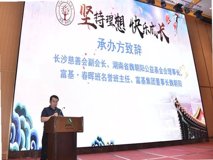 ▲长沙市平江商会会长、长沙慈善会副会长、湖南省魏朝阳公益基金会理事长、富基·春晖班名誉班主任、富基集团董事魏朝阳致辞