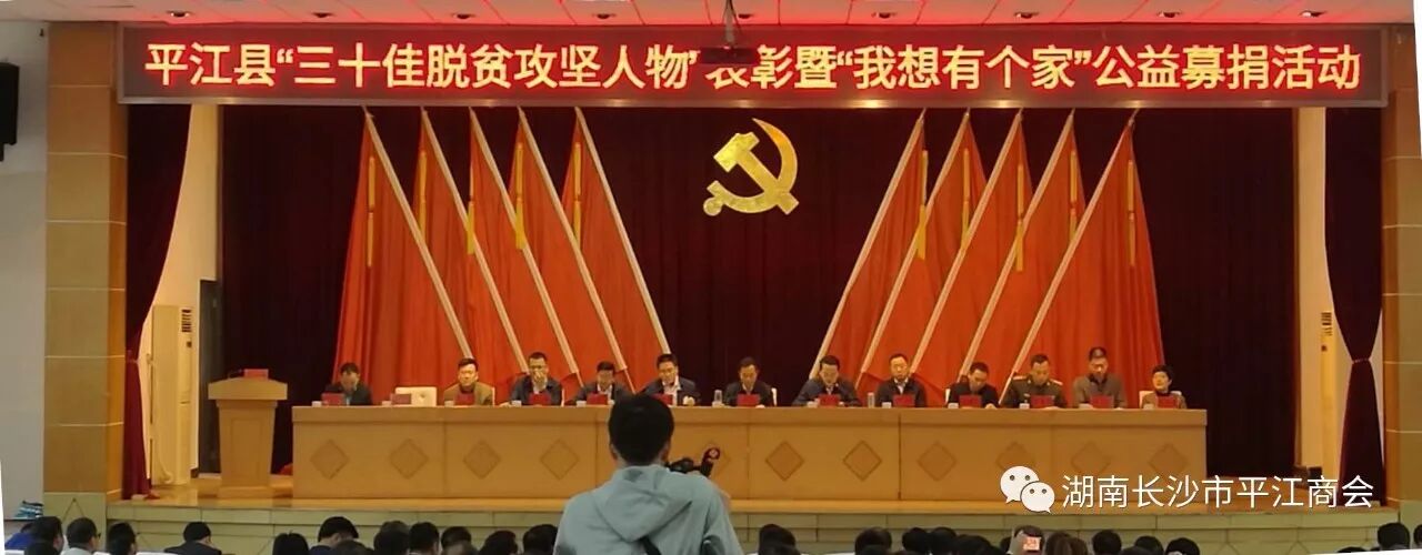 10月17日,从平江县2017年“三十佳脱贫攻坚人物”表彰大会暨“我想有个家”公益募捐活动中传来喜讯,长沙市平江商会会长、富基实业集团有限公司董事长魏朝阳,长沙市平江商会常务副会长、湖南旺辉食品有限公司董事长徐旺晖双双获得2017年度平江县“十佳扶贫爱心人士”光荣称号,这是长沙市平江商会全体会员的共同光荣,是中共平江县委、平江县人民政府对我会2017年助力家乡脱贫攻坚战役,“大爱平江”结对帮扶工作的充分肯定。