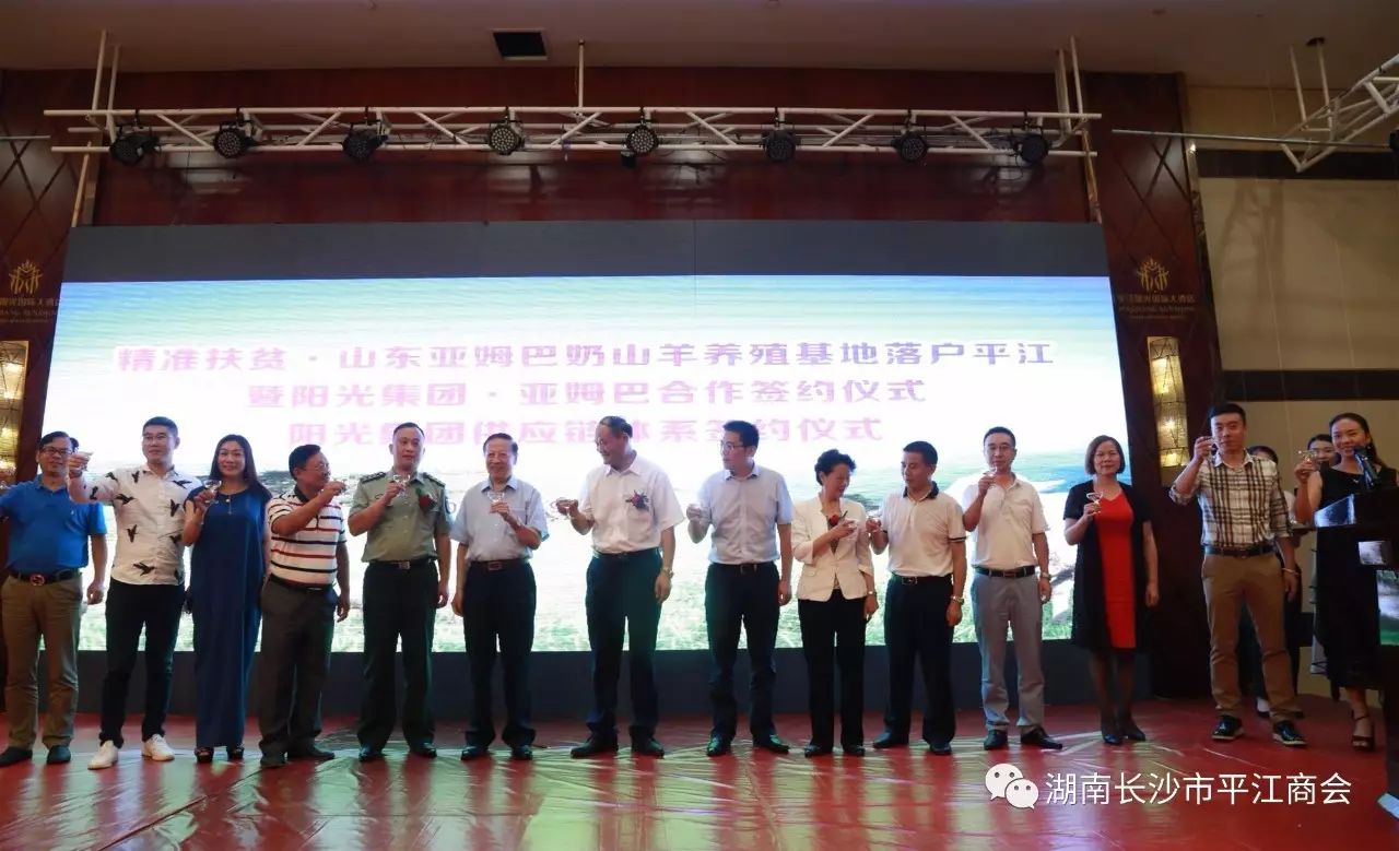 阳光集团·山东亚姆巴乳业有限公司签署合作协议,先期养殖1万头奶山羊,标志着精准扶贫•山东亚姆巴奶山羊养殖基地正式落户平江,湖南养殖亚姆巴奶山羊实现了零的突破,湖南人喝上本土产的山羊奶的美事指日可待。阳光集团与湖南家天下中老年旅游公司等四家知名企业合作协议的签署,亦标志着阳光集团已基本实现产、供、销一体化,供应链体系正式建立和完善,喻示着阳光集团已正式步入加速发展的快车道。