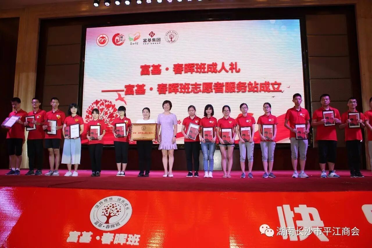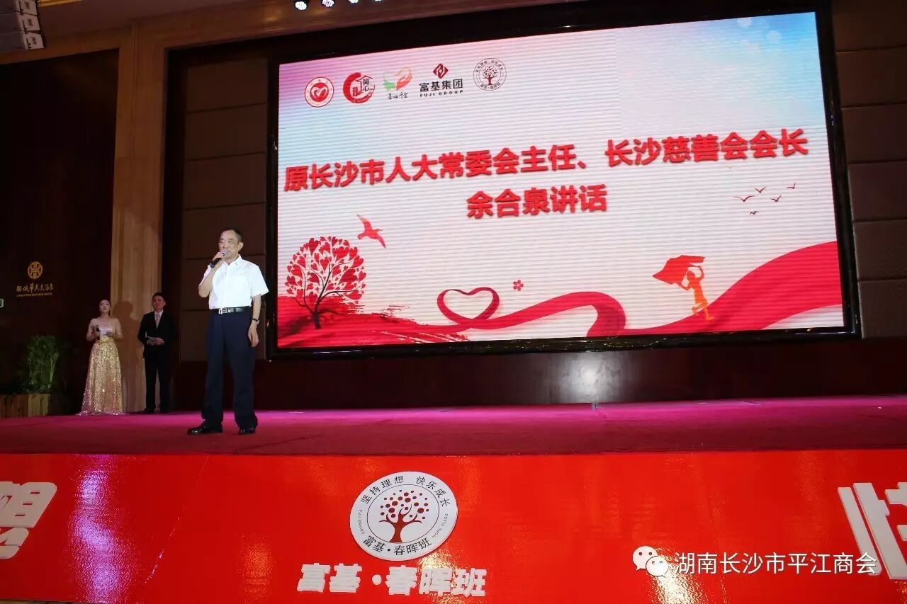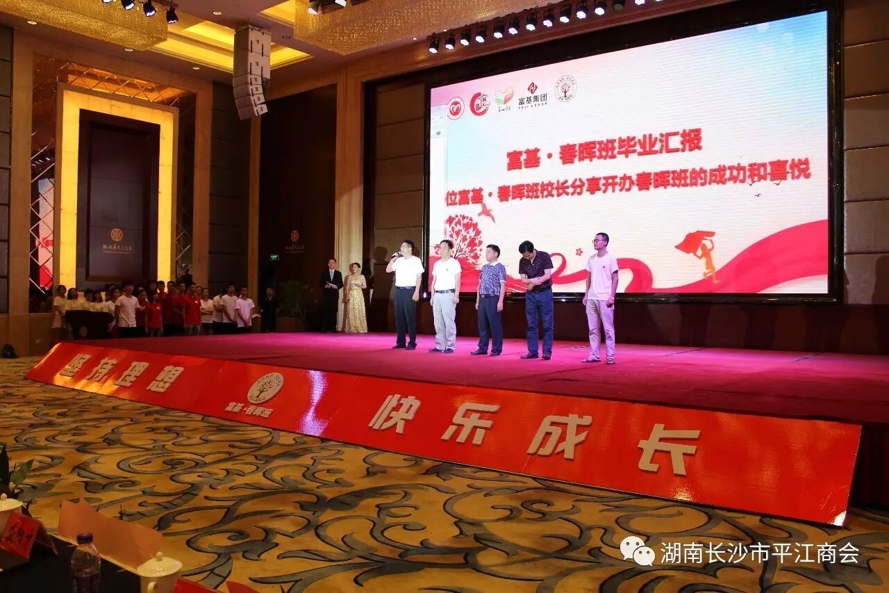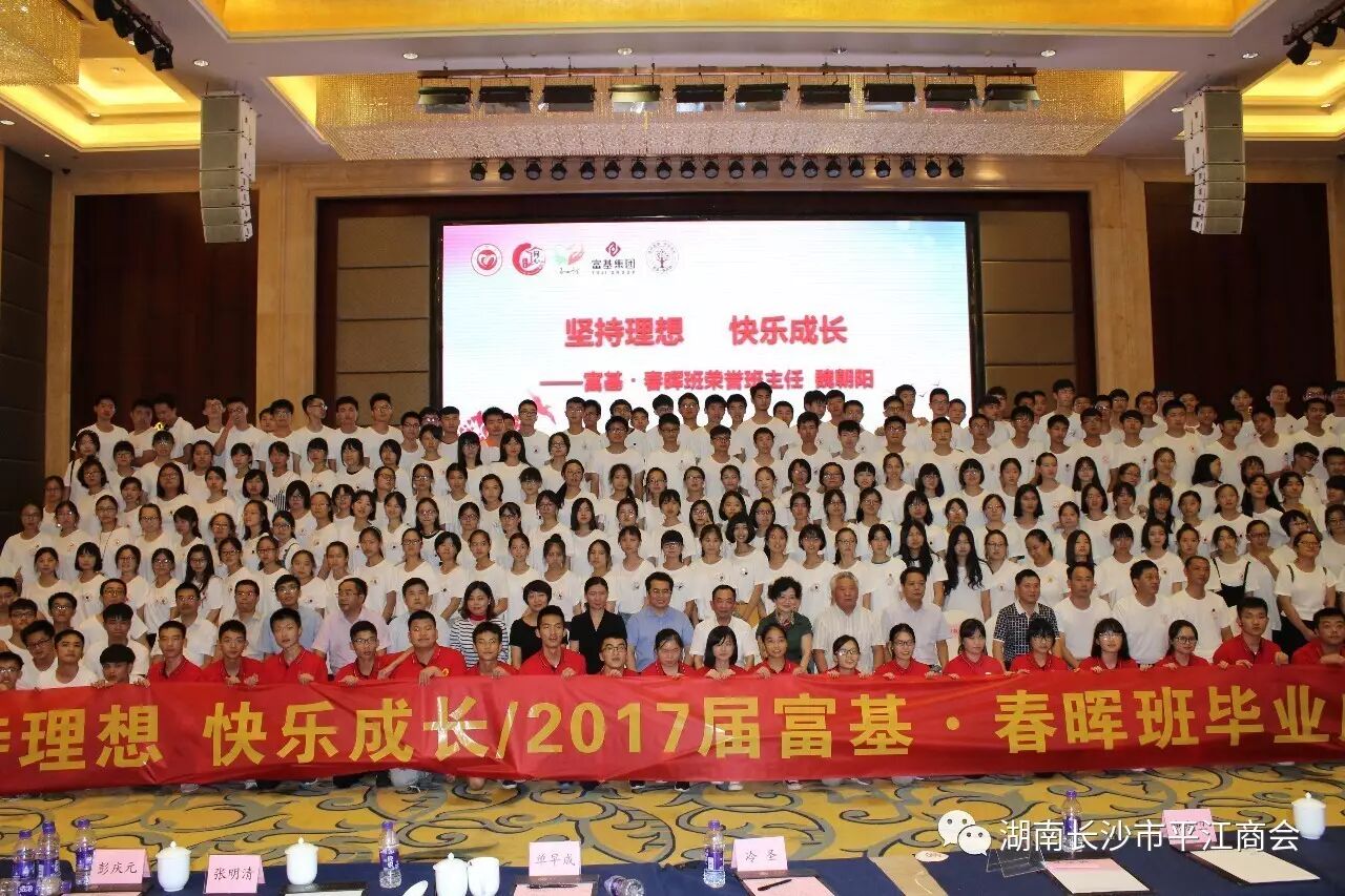 三年寒窗苦,折桂报春晖。富基·春晖班再传捷报:2014届春晖班今年应届毕业,347名春晖学子参加高考,345名上大学本科线,上线率达99.42%,其中600分以上的70人,占20.29%。为感恩春晖班老师辛勤培育,勉励学子发奋图强,8月15日,富基集团在长沙市望城区联诚华天大酒店隆重举行“同心之声·春晖之光”2017届富基·春晖班学子成人典礼。本届毕业春晖学子及春晖在读学生代表360名与春晖班所在学校负责人、本届春晖班班主任老师应邀出席。原长沙市人大常委会主任、现长沙慈善会会长、市慈善基金会理事长余合泉,长沙市民政局党委书记、局长、长沙慈善会副会长、市慈善基金会副理事长陈昌佳,望城区区委书记孔玉成,区委常委、统战部长、区社会扶贫工作领导小组组长喻霞元,望城区政府副区长易文龙,望城区民政局党组书记、局长唐晓卫,长沙市平江商会会长、富基春晖班名誉班主任、富基集团董事长魏朝阳,长沙市平江商会领导、社会各界爱心人士及嘉宾计460余人参加典礼。