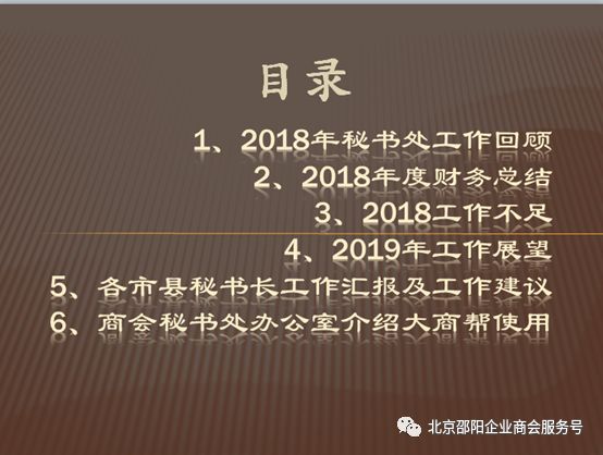 秘书处办公室主任邓素芳针对2018年秘书处工作进行回顾,2018年是秘书处夯实基础工作的一年,组织了商会换届选举大会与中华邵商联合会会长会议,成立了新宁分会、武冈商会、邵东分会,参加省、市委市政府来京举办的旅游推介、商品招商等会议,拜访在京兄弟商会、京外的邵阳兄弟商会及北京邵阳企业商会会员单位,举办会员线下活动,打造微信公众号平台。