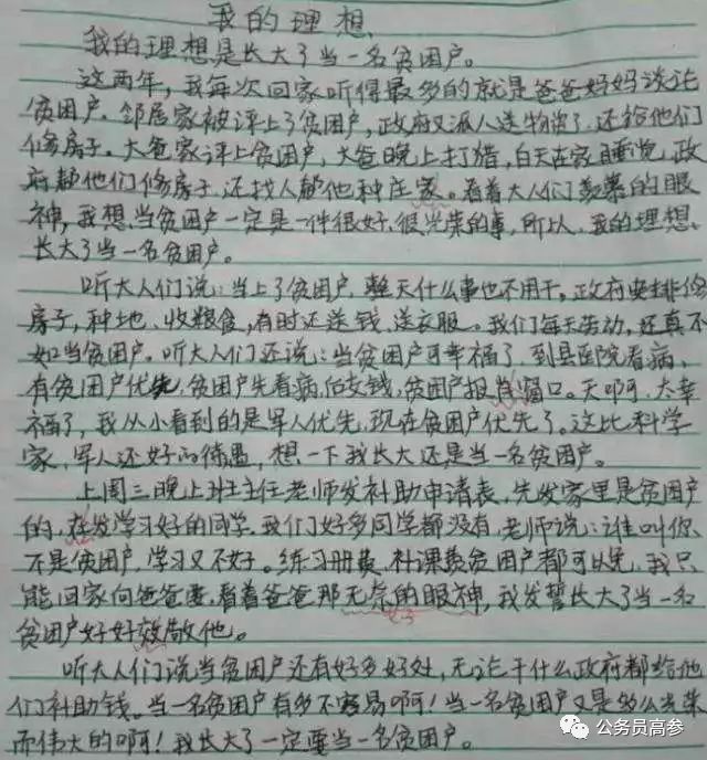 于是,有个孩子写作文时,表达了雄心壮志:我长大了也要当贫困户。