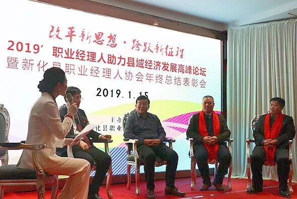 “改革新思路.跨越新征程”。1月15日, 2019•职业经理人助力县域经济发展高峰论坛在湖南新化县华天酒店二楼会议厅召开。民进中央经济委员会副主任王林,湖南省职业经理人协会执行会长孙朝阳、新化县委常委、统战部长曾令斌、县人大常委会副主任刘晓英、县工商联主席陈永松、县关工委主任刘亮光、妇联主席钟英姿、团县委书记曾志文等应邀出席。