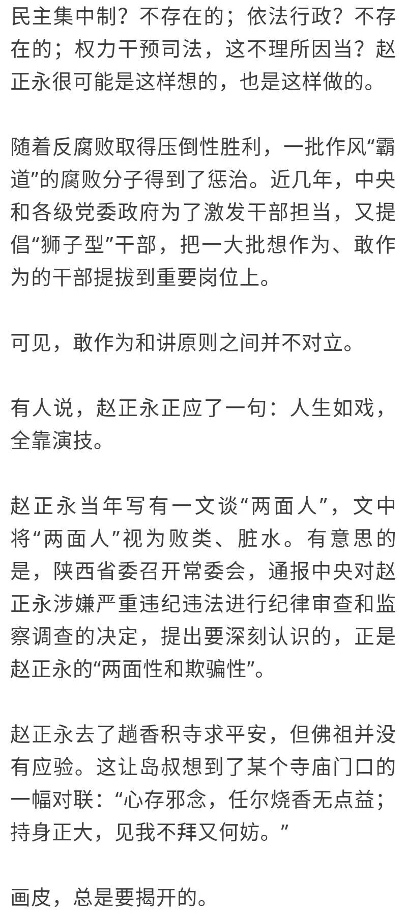 知情人士给岛叔透露,赵正永在工作中极为霸道,“当省长时很多事情自己定,不向省委书记汇报;当省委书记时,却经常管政府的事”。现在看来,赵正永不仅没有大局意识,且带头违反民主集中制原则,这才是这次陕西官场乱象的根源。