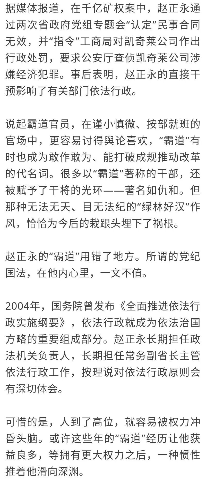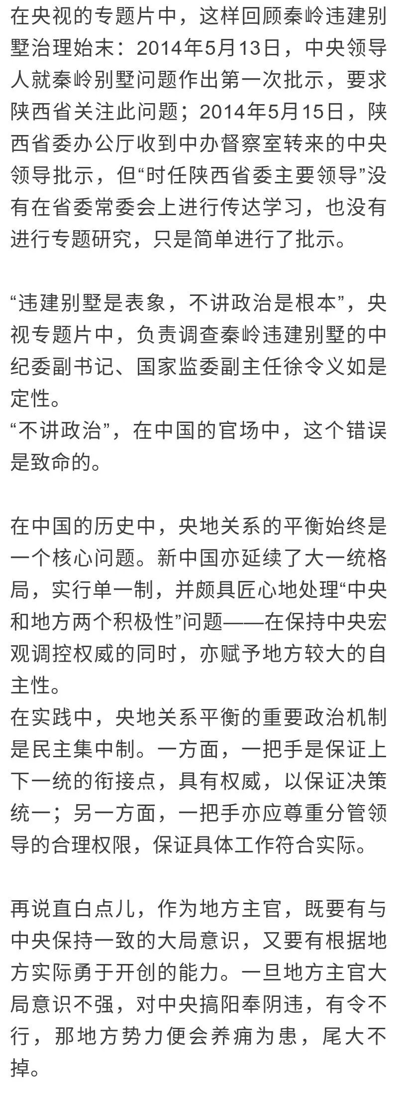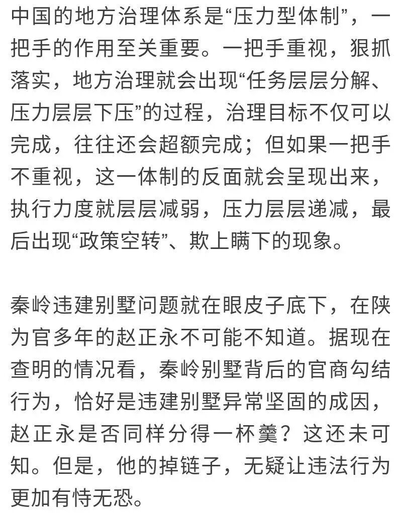 而在秦岭违建别墅事件中,赵正永对总书记批示几近敷衍,无异在保证政令畅通中掉了链子,也直接导致中央的生态政策无法在陕西落实。