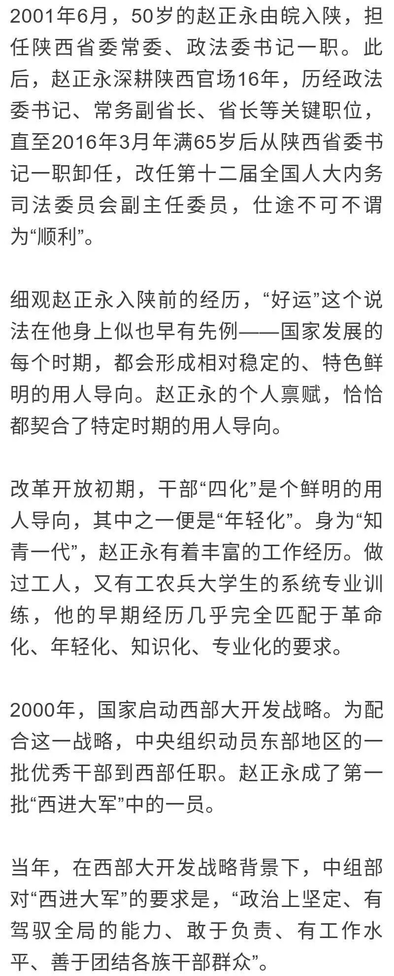 而赵正永呢,当时身在安徽,“恰恰”有多年主政黄山市、担任过省公安局局长、政法委书记的履历,期间又处置过重大事件。如果说“四化”干部为赵正永在安徽的仕途晋升提供了最好的通行证的话,那么,西进大军“优秀干部”的符号,则是他后来入陕的最好光环。